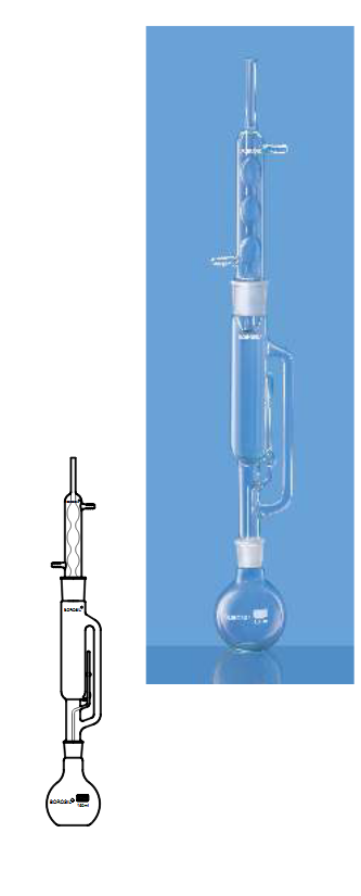 Liquid Solid Extraction involves theelution of a solid sample with pure solvent vapour. The sample is held in the Extractor body either directly or in a thimble. The siphoning type of Soxhlet Extractor finds the widest application in laboratory work. Borosil Soxhlet Extraction Apparatus is available in six sizes. The component parts of the apparatus are provided with interchangeable joints for greater flexibility.